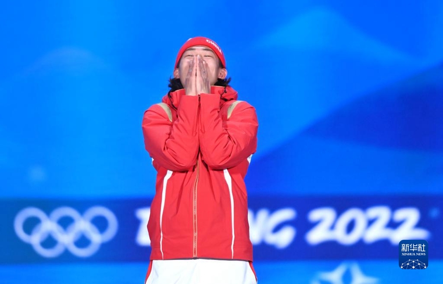 2月15日,在北京赛区颁奖广场,冠军中国队选手苏翊鸣在北京2022年冬奥会单板滑雪男子大跳台奖牌颁发仪式上。新华社记者 黄宗治 摄