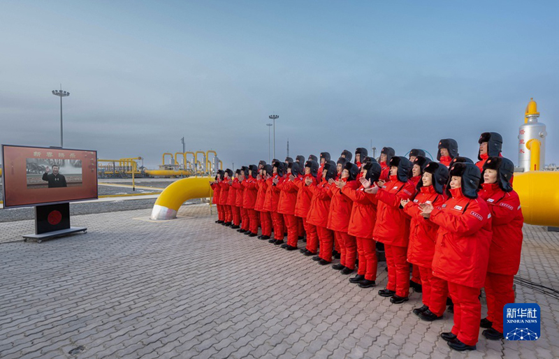 1月18日,中共中央总书记、国家主席、中央军委主席习近平在北京通过视频连线看望慰问基层干部群众,向全国各族人民致以新春的美好祝福。这是习近平通过视频连线,同塔里木油田公司轮南油气储运中心西气东输第一站克拉集气区员工亲切交流。(新华社记者 李涛/摄)