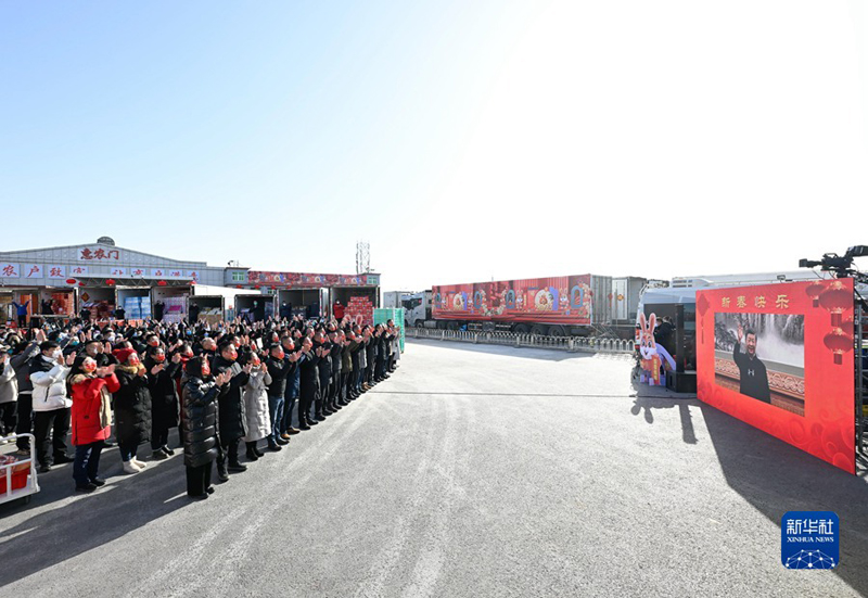 1月18日,中共中央总书记、国家主席、中央军委主席习近平在北京通过视频连线看望慰问基层干部群众,向全国各族人民致以新春的美好祝福。这是习近平通过视频连线,同北京新发地农产品批发市场的商户和采购年货的群众亲切交流。(新华社记者 李涛/摄)