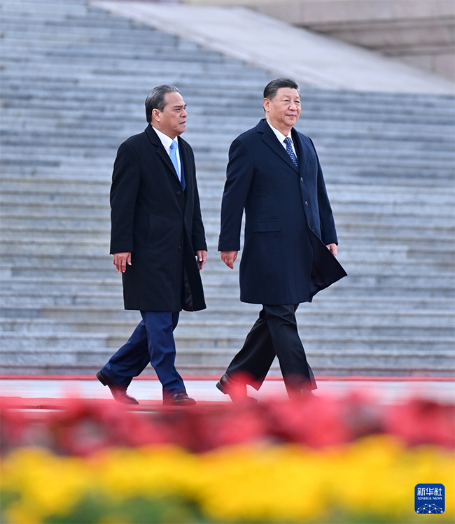 4月9日下午,国家主席习近平在北京人民大会堂同来华进行国事访问的密克罗尼西亚联邦总统西米纳举行会谈。这是会谈前,习近平在人民大会堂东门外广场为西米纳举行欢迎仪式。(新华社记者 殷博古/摄)