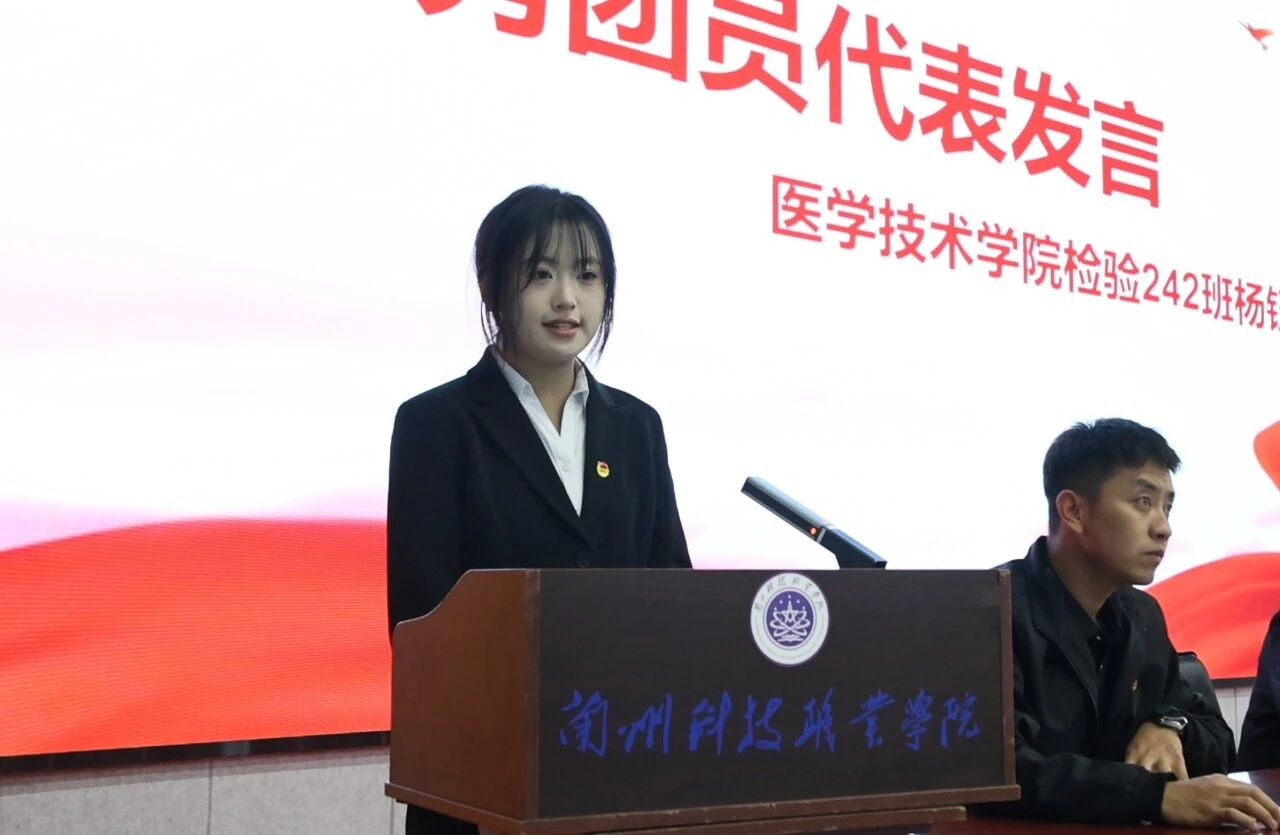 优秀团员代表、医学技术学院检验242班杨钰婷同学分享了在团组织中的成长感悟,勉励新老团员在互学互鉴中共同进步。新团员代表、财经商贸学院幼管242班赵珍珍同学表达了加入共青团的激动心情和肩负使命的坚定决心,承诺将以实际行动践行誓言,为团组织增光添彩,并代表全体新团员郑重承诺:“请党放心,强国有我”。